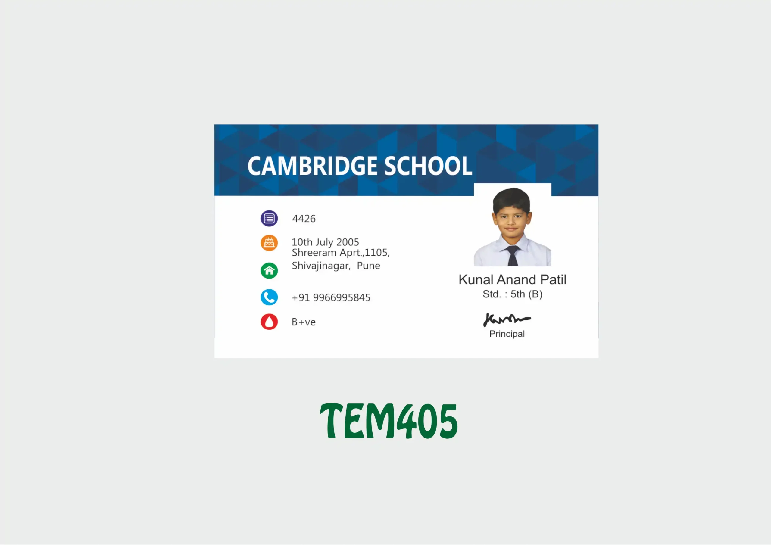 Easy to Edit: Name, Photo, ID No., Class, Designation, Address, Mobile No.